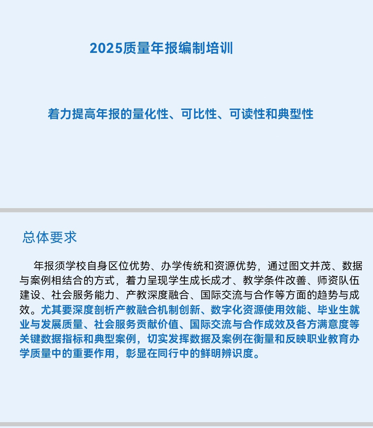 会上,全体参会人员集中学习了辽宁省教育厅、大连市教育局《关于做好职业教育质量报告(2025年度)编制、发布和报送工作的通知》中的有关精神和要求。会议强调了质量年报工作的重要性,包括提高政治站位、强化质量意识、加强组织保障等方面。会议指出,质量年报是职业教育履行职责担当、树立质量发展观、宣传发展成绩、接受社会监督的重要载体。会议对质量年报撰写工作提出具体要求和任务分工,从质量年报编制主要内容、数据填报、文本和案例撰写要求及有关注意事项等开展专项培训。